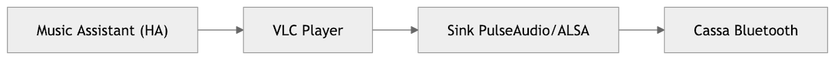 Music Assistant gestisce i flussi multimediali e li invia a VLC insieme a eventuali comandi di riproduzione (play, pause, next, volume).